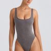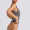 Mix-and-match staples. The perfect base for off-duty looks, this bodysuit is crafted from buttery soft Seamless Rib fabric with a subtly faded acid wash effect for a lived-in look. It features a scoop neck, fixed crossover back straps and a thong base for an undetectable finish under leggings, shorts and flared trousers from the collection.