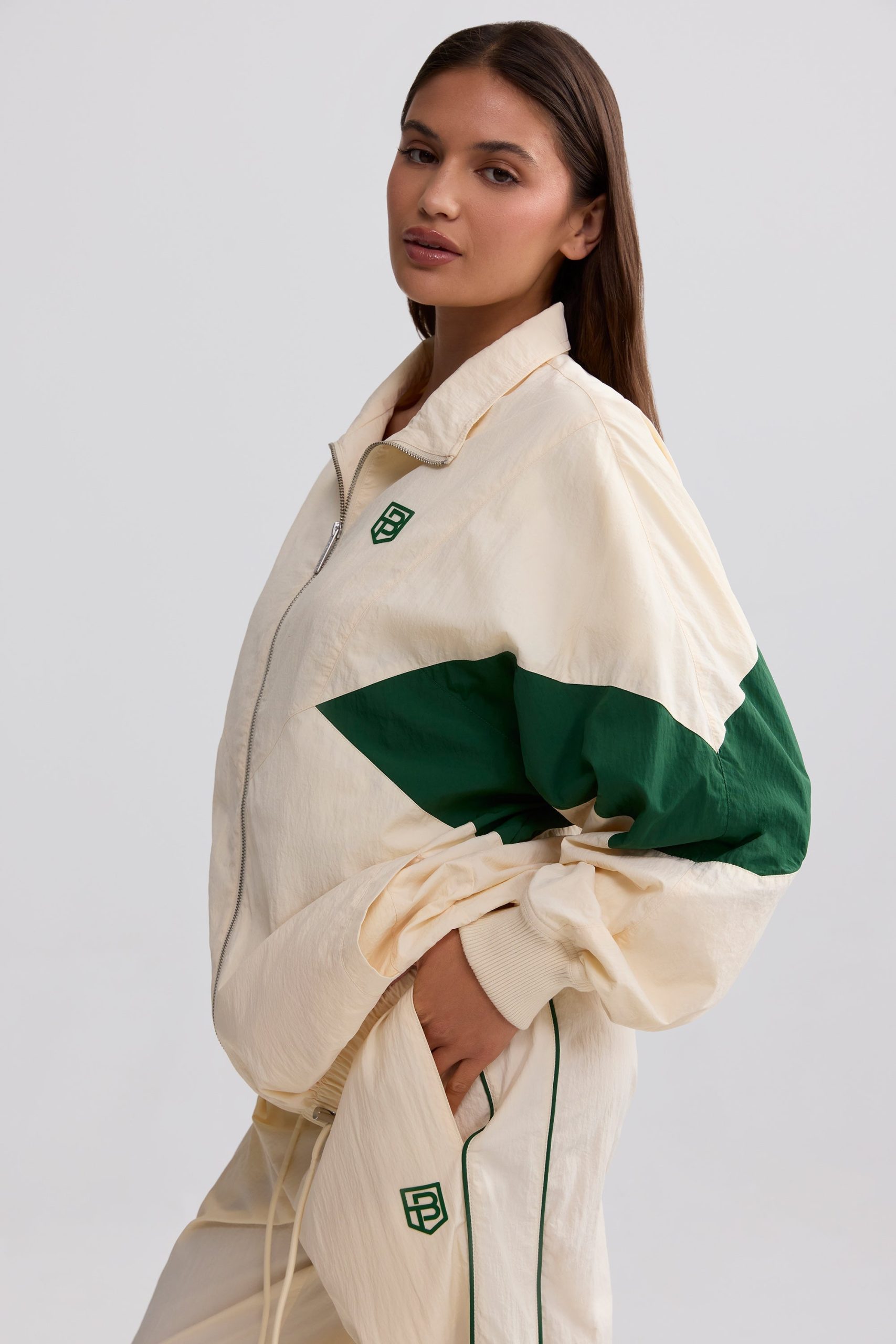 Up your styling game. Inspired by classic coach styles, this track jacket is crafted from lightweight, water-repellent and lightly crinkled nylon fabric, making it ideal for year-round styling. It’s cut to an oversized fit, tempered with an elasticated hem with adjustable drawstrings, and features a stand-up collar, contrasting colourblock panels and a football-inspired crest logo at the chest.