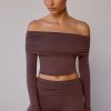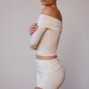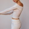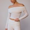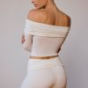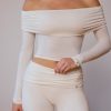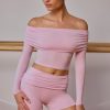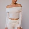 Set the barre. Crafted from soft, lightweight, and sheer stretch jersey, this top is the perfect off-duty layering piece to take you from the workout studio to brunch. It’s cut to an off-shoulder silhouette, framed with a fold-over ruched neckline, and finished with a woven Bo&Tee logo badge.