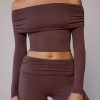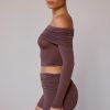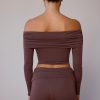 Sheer Off-Shoulder Long-Sleeve Top in Taupe Brown