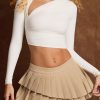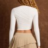 High-impact silhouettes. A wardrobe staple with elevated twist, the Leona top is enhanced with all-over asymmetric ruching. It’s crafted from premium semi-sheer stretch jersey to a sculpting bodycon silhouette, framed with a spliced neckline and long fitted sleeves.