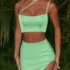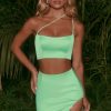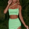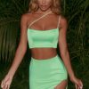 Live in the moment in our mint mini skirt, designed in structured smooth satin fabric for a luxurious look. The skirt sits high-waisted in a figure hugging fitthat’s made to flatter your curves, trimmed with diamante embellishment that leads to a seductive asymmetric side split. Styled best with our satin cropped top and strappy sandals for an eye-catching ‘fit.