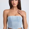 Designed to enhance classic double-denim looks, the Dalani crop top is modelled on classic corsetry. It’s crafted from premium stretch denim to a curved silhouette and framed with a bandeau neckline, complete with detachable, adjustable camisole straps for custom styling. It’s elevated with moto-inspired quilted panels and signature lace-up detailing on each side.