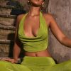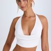 Elevated separates. A classic with a signature twist, the Sonia crop top is crafted from premium, textured stretch jersey to a halterneck silhouette with an adjustable strap at the nape for your perfect fit. It features a plunging cowl neckline and an open back with statement strappy detailing.