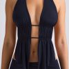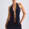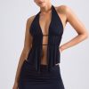 Tactile textures and unique details. A statement twist on classic halterneck styles, the Larisa top is crafted from soft sheer jersey to an asymmetric silhouette with an open front, secured with minimal strap detailing and enhanced with ruched panels that fall to a waterfall hem. The open-back is finished with symmetrical adjustable straps for a custom fit.