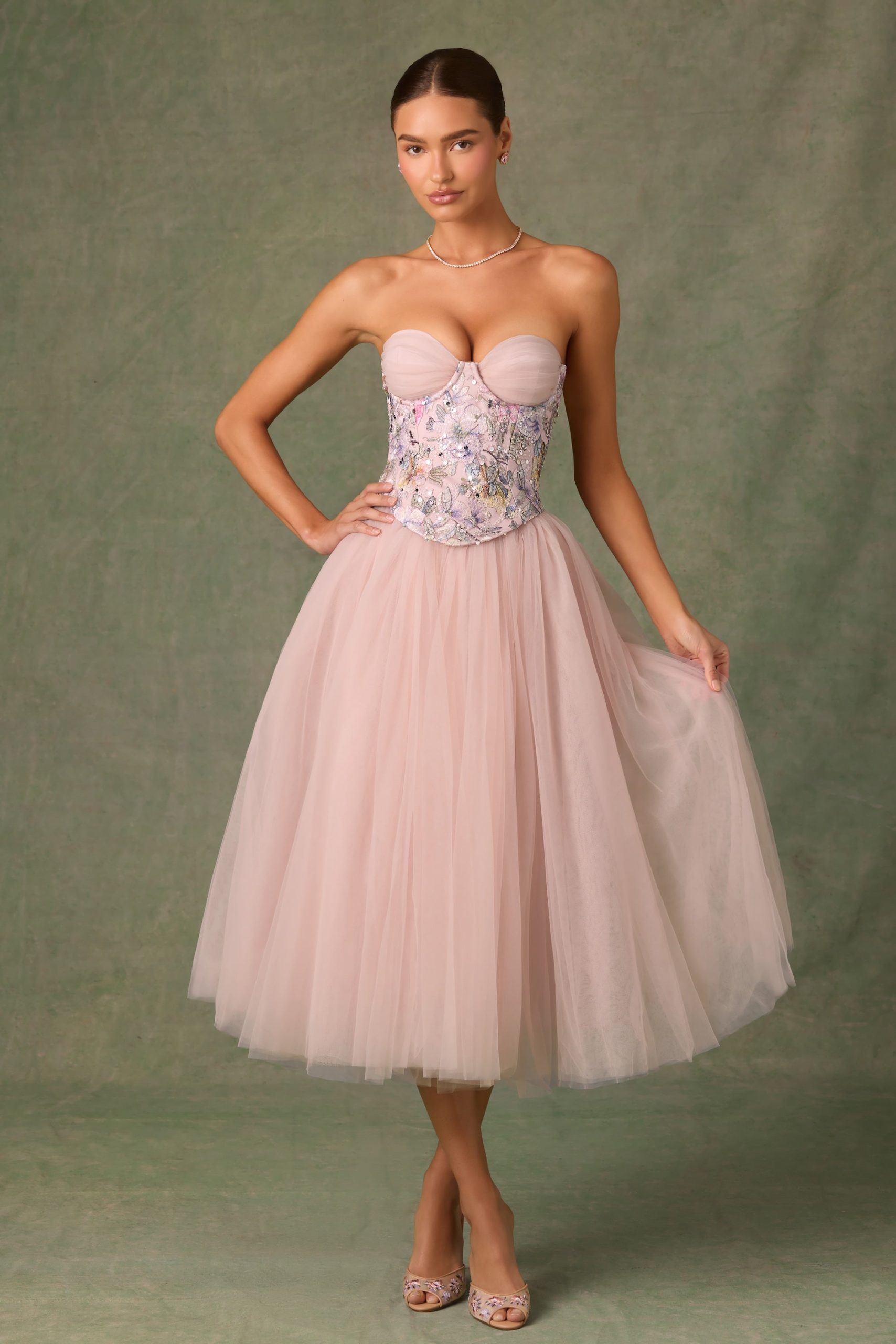 A fresh take on classic styles, the Elia corset is designed to add interest to any look. It’s crafted from figure-defining mesh fabric, overlaid with custom watercolour-inspired floral appliqués and the perfect topping of sparkling sequins. Cut to a cupless silhouette for versatile styling, it’s framed with a curved hem for instant sculpting and features an adjustable lace-up back for your perfect fit every time.