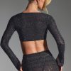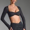Sparkling staples. Designed to be styled with the coordinating maxi skirt from the collection, the Lumina crop top is crafted from premium 20D stretch mesh to a striking cropped silhouette, complete with ruched detailing at the front. It’s framed with long fitted sleeves and adorned with signature tonal HOTFIX embellishments that glitter under the light.