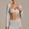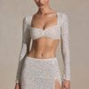 Sparkling staples. Designed to be styled with the coordinating mini skirt from the collection, the Lumina crop top is crafted from premium 20D stretch mesh to a striking cropped silhouette, complete with ruched detailing at the front. It’s framed with long fitted sleeves and adorned with signature tonal HOTFIX embellishments that glitter under the light.