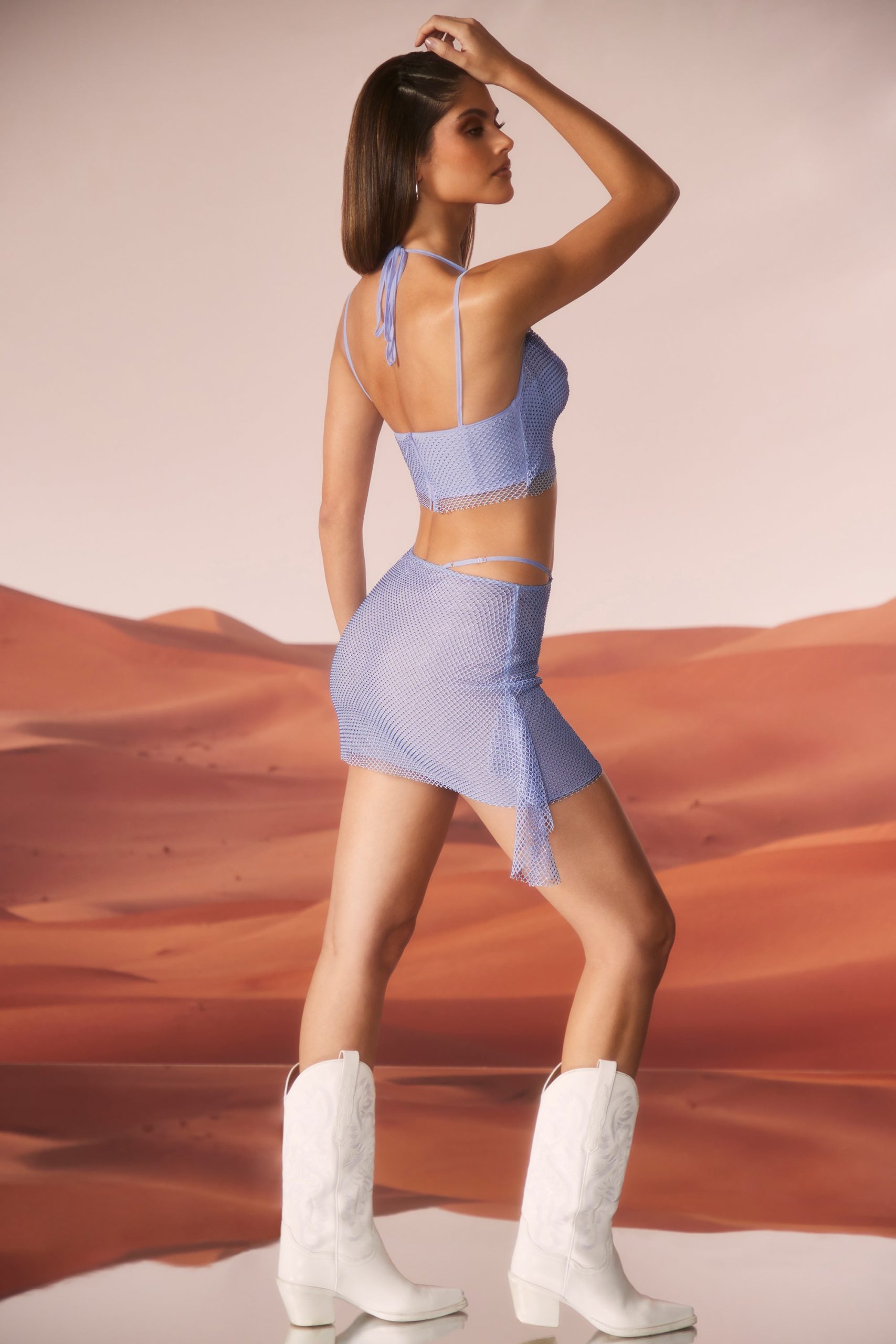 Create the ultimate festival co-ord with the Roux mini skirt. Cut from our premium semi-sheer stretch mesh fabric with luxury embellished fishnet overlay, Roux is a curve hugging mini skirt with asymmetric hemline that elongates the legs. With a high angled waistband with a narrow adjustable side strap, the Roux mini skirt is complete with side frills that accentuate your shape.