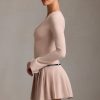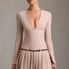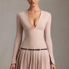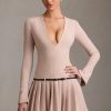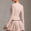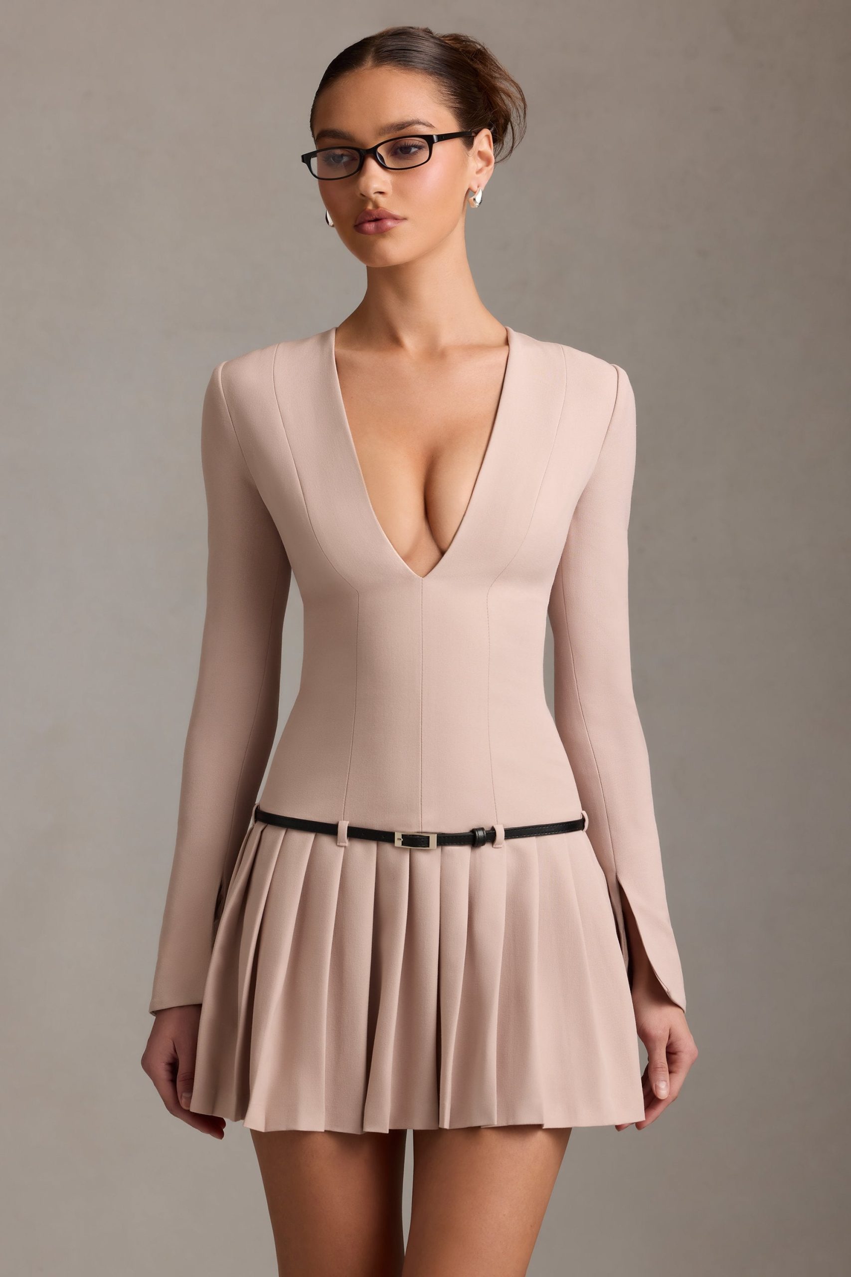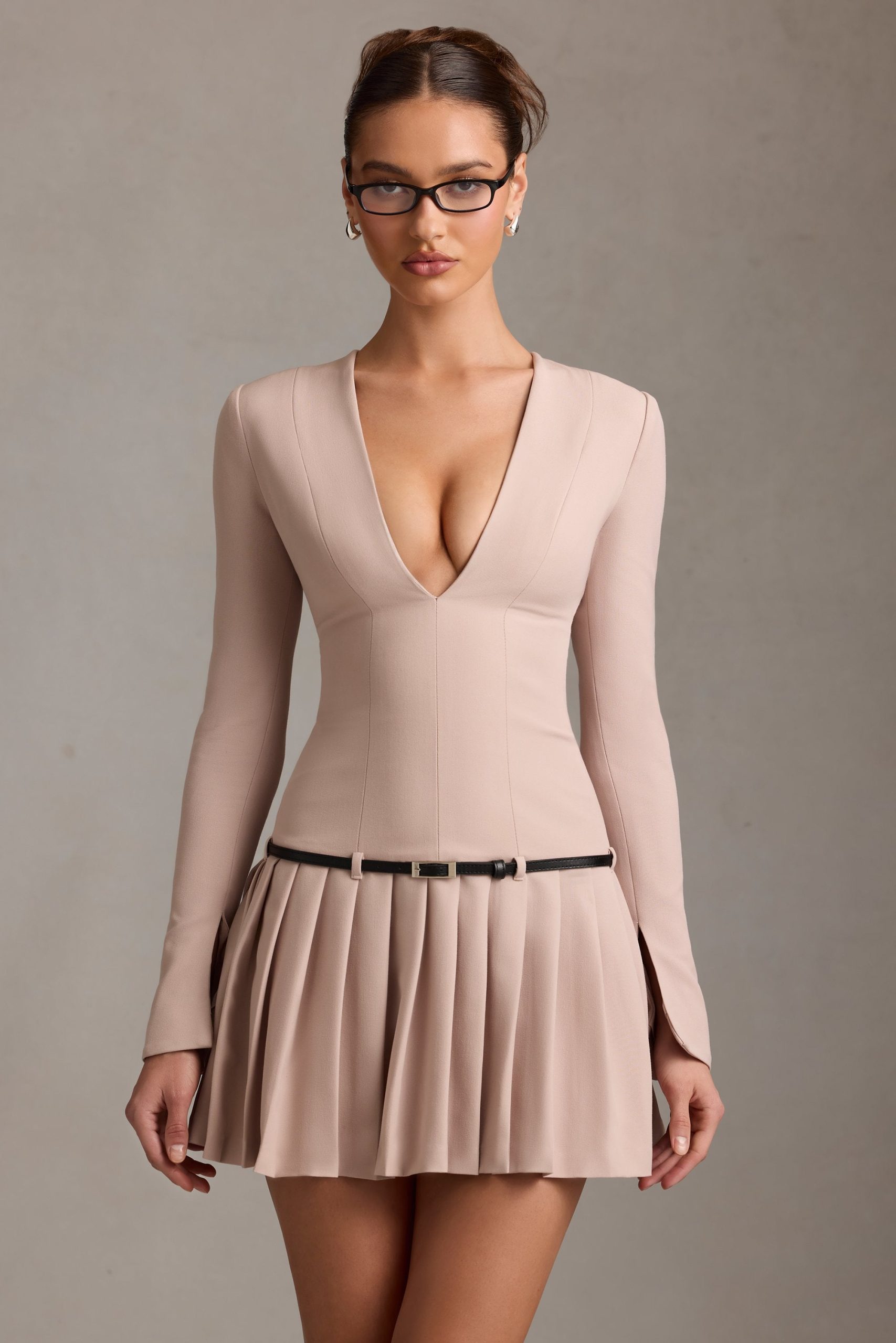 Tailoring that speaks for itself. Inspired by timeless silhouettes with a signature twist, the Fiorella mini dress is made from premium woven suiting fabric with a drop-waist bodice enhanced with contouring seams and a contrasting functional belt. It features a pleated mini skirt and is framed with a plunging V-neckline and long sleeves with split cuffs.
