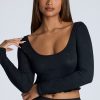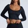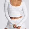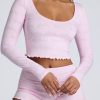 The Loungewear crop top is the perfect piece for relaxing at home. Cut close to the body and designed in our lightweight, stretchy pointelle jersey, the Loungewear crop top features all-over embossed Oh Polly branding. With a flattering scoop neck, long sleeves, and pretty lettuce hem edging, this is the lounge essential you’ll love throughout the cozy season.