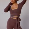 Long-Sleeve Wrap Crop Top in Taupe Brown