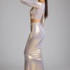 Create a memorable two-piece look with the Zahra gown skirt. A statement separate designed in our premium metallic jersey fabric, Zahra is cut close around the hips with curve-accentuating ruching and power mesh lining. Its maxi length and flattering fishtail silhouette effortlessly complements the Rana crop top.