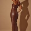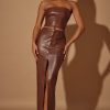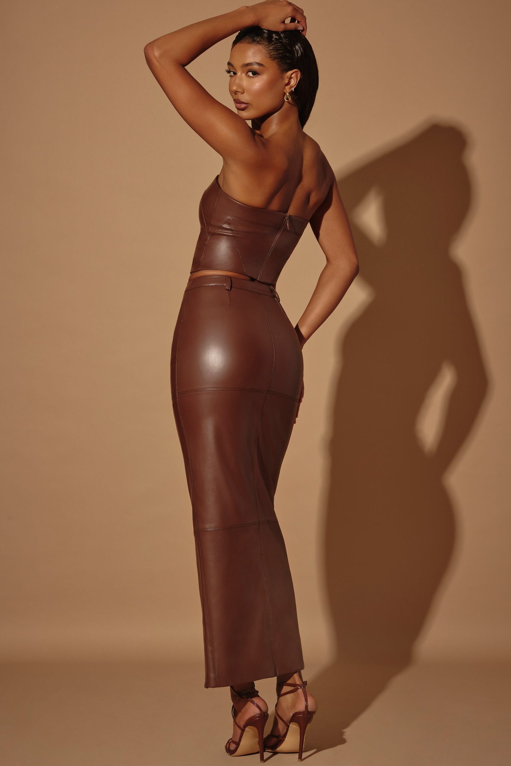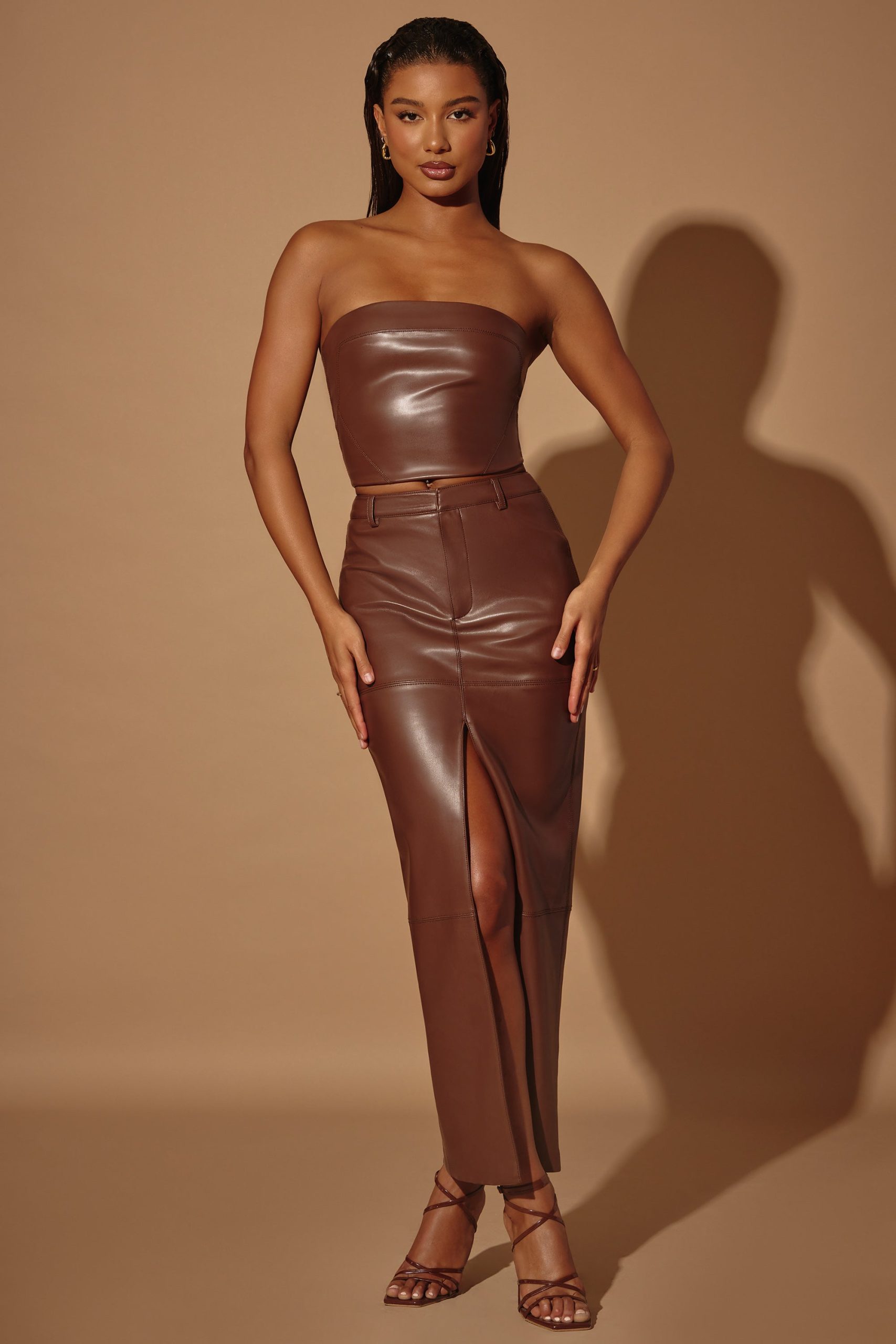 Created in our premium vegan leather fabric with a mid-rise waist, Cylan is a bodycon maxi length skirt which features a panelling design throughout. Complete with a high split at the front that allows for ease of movement, our leather maxi can take you from day to night and can be paired with our Lilica vegan leather corset.