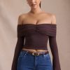 Slip into relaxed luxury with the Pavni top. Made from soft and luxe modal-cashmere blend with breathable, temperature-regulating properties and cloud-like softness, it’s cut to a figure-defining bodycon silhouette, framed with an off-shoulder ruched neckline and long flared sleeves, perfect for pairing with a coordinating maxi skirt or jeans for a dressed-up casual vibe.