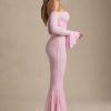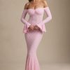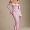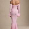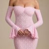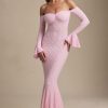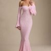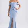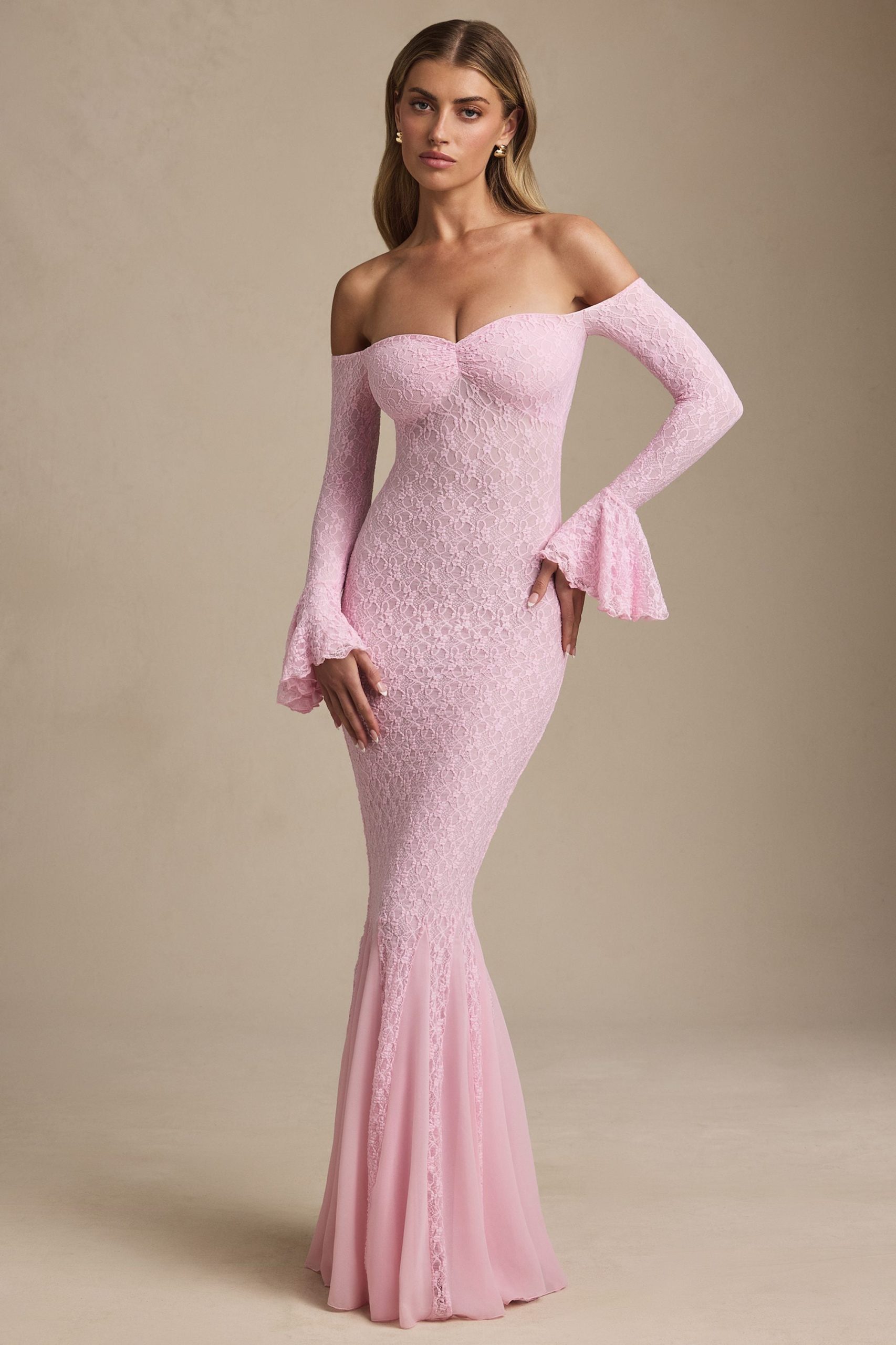 Romantic silhouettes, best served under the sun. Crafted from premium stretch lace with a soft, sheer jersey lining, the Verena maxi dress is cut to a figure-hugging fishtail silhouette. It’s framed with an off-shoulder sweetheart neckline and long fitted sleeves with delicate ruffled cuffs. The contrasting godet pleats create stunning movement with every step.