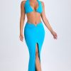 Summer staples. Ideal for creating a coordinating vacation look, the Vella crop top is available in two standout hues. It’s crafted from premium, soft-touch sheer jersey to a plunging halterneck silhouette. In keeping with the minimalist aesthetic, it’s detailed with a small rounded cut-out at the back, anchored with polished O-ring hardware.