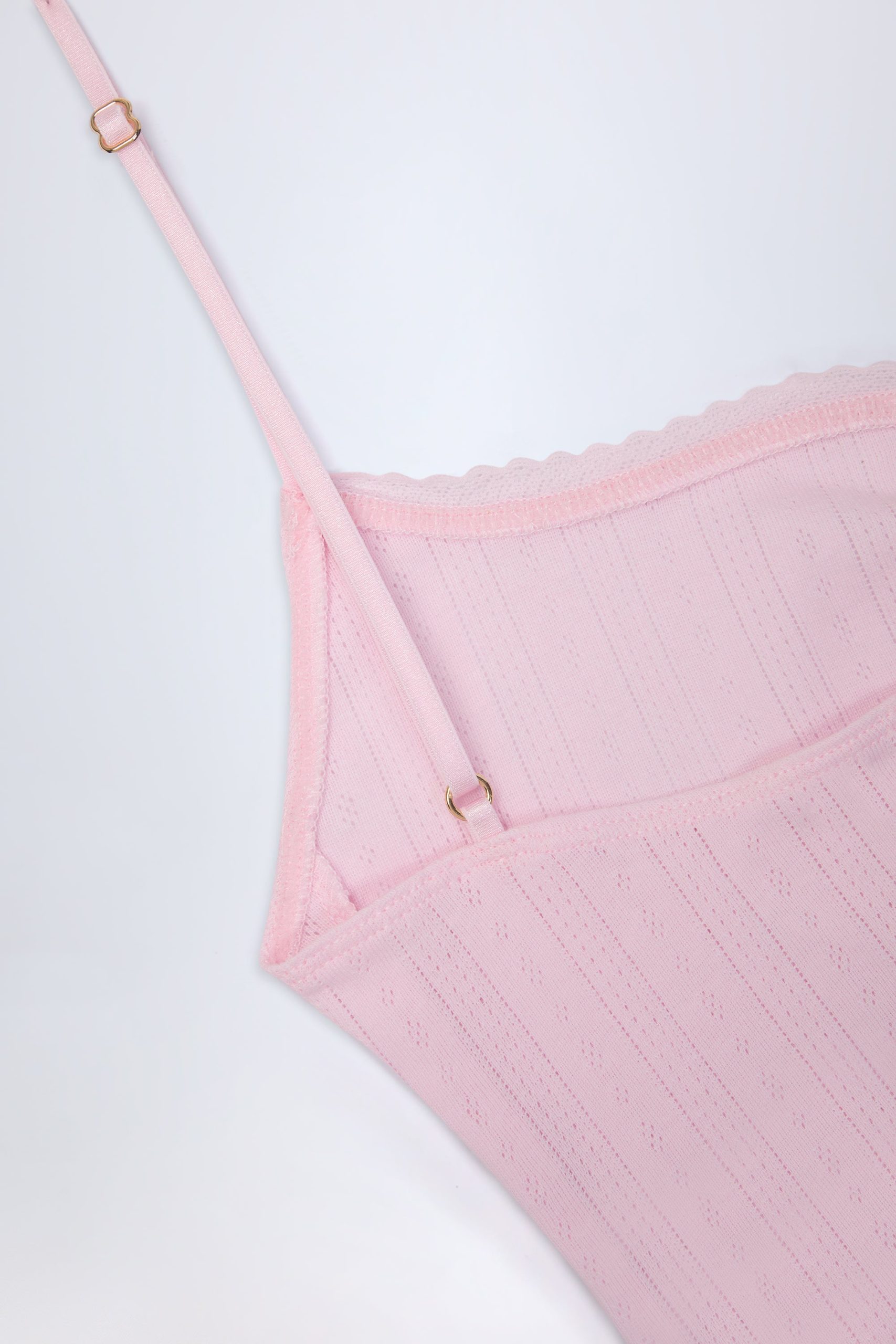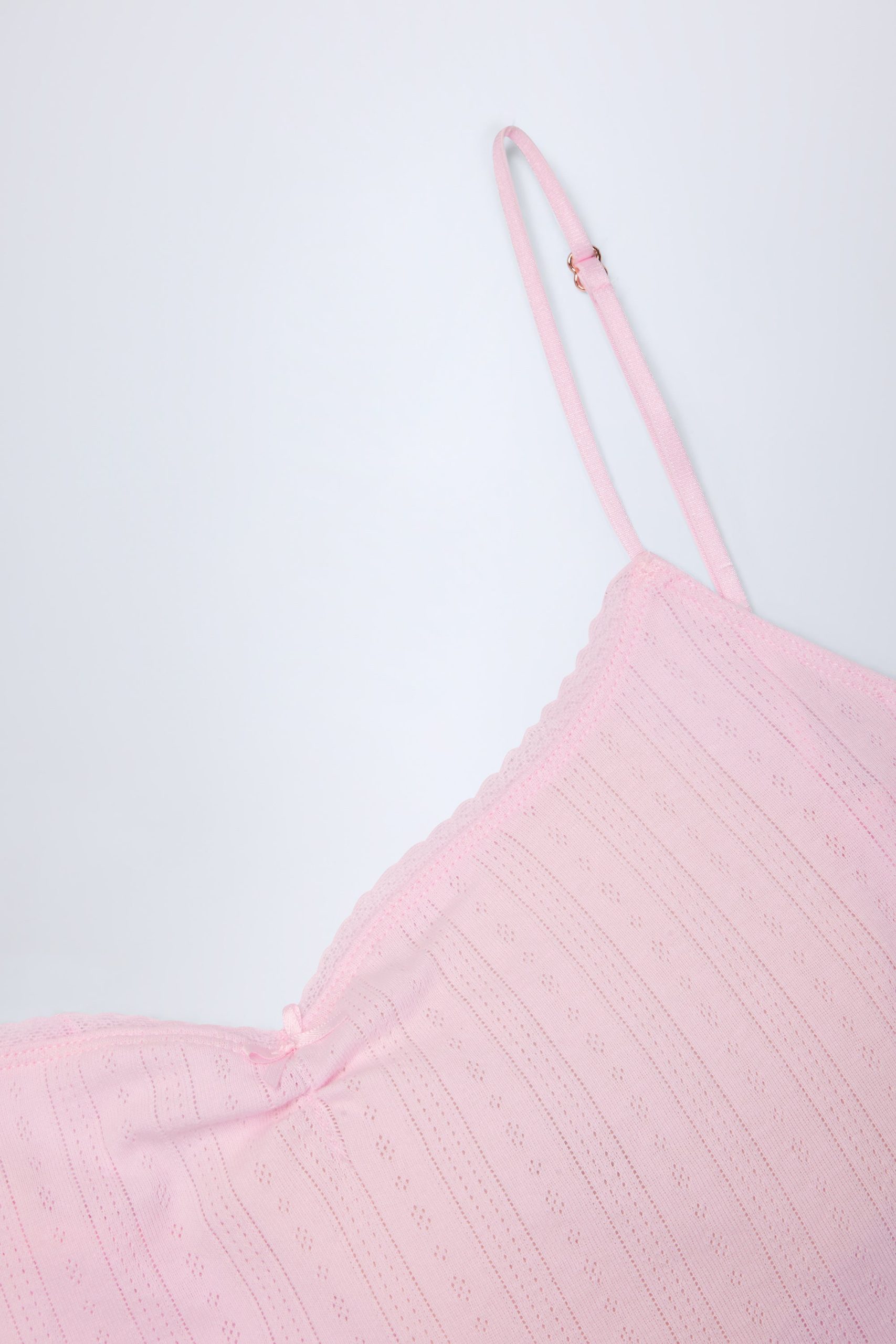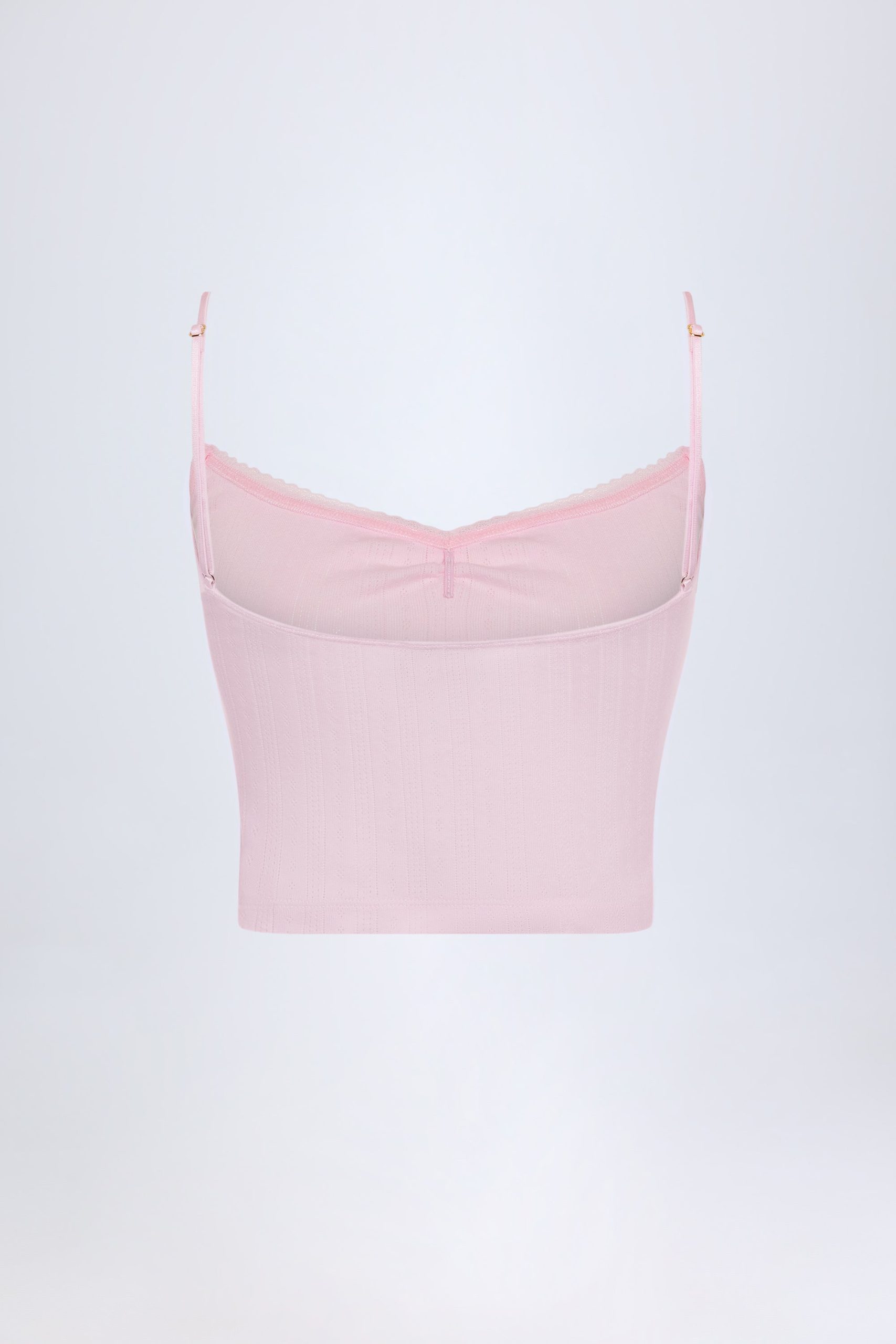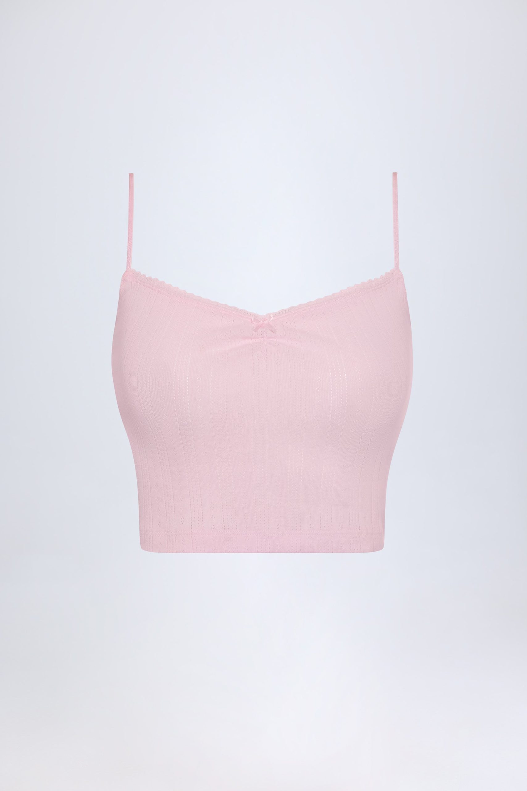 Pairs perfectly with slow mornings. Lightweight, breathable and oh-so soft, the Livia crop top is crafted from cotton jersey with a delicate pointelle texture for easy styling with the coordinating trousers. It’s cut to a classic camisole silhouette with a sweetheart neckline, framed with a pretty lace picot trim, light ruching at the bust, and a tonal bow embellishment.