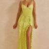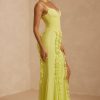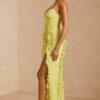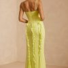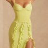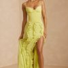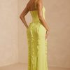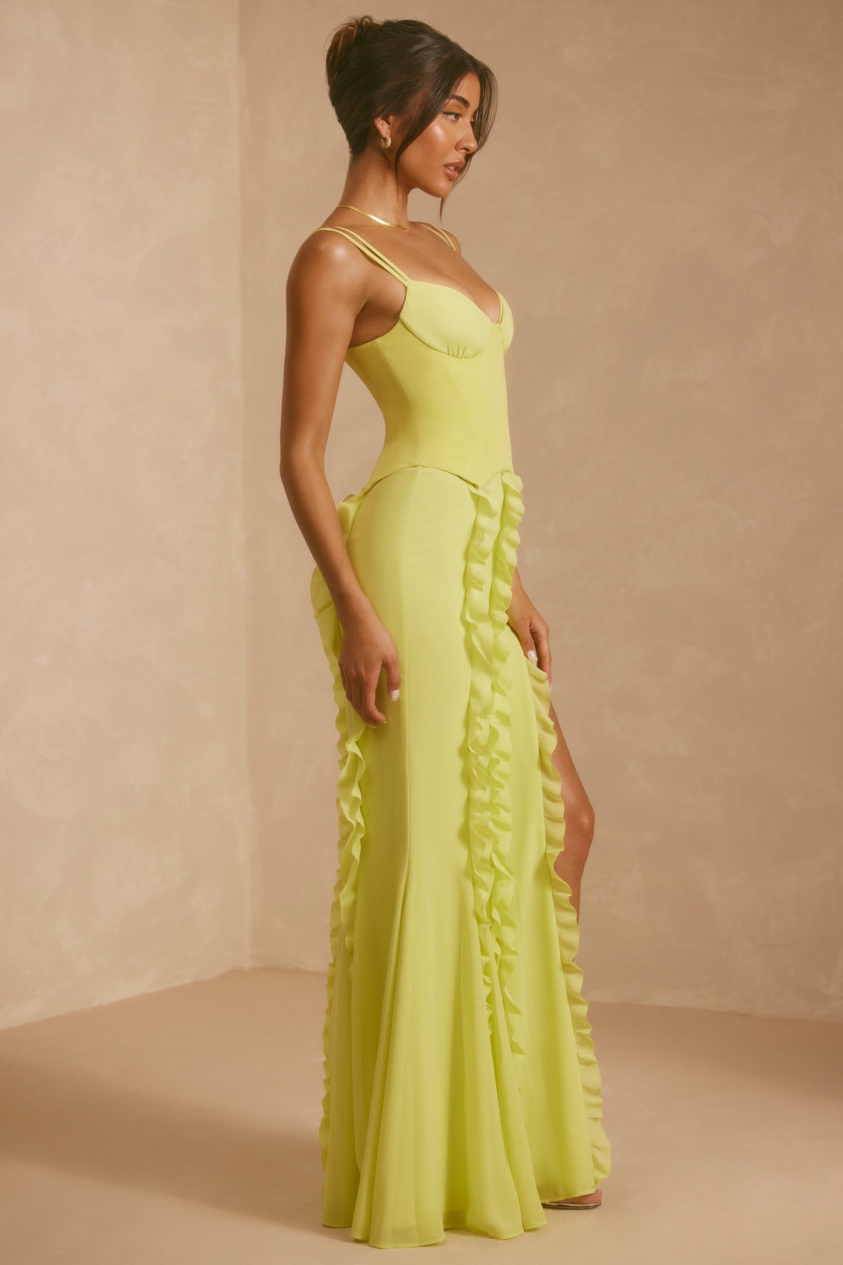Grand entrances in Perrine. Embodying effortless allure, Perrine is an ultra seductive and flattering design with a deluxe satin corset that works to cinch your waist and ruched underwired cups that provide elevated support and lift. Featuring a flowing maxi skirt designed in our lightweight georgette fabric with ruffle detailing throughout that delicately cascades as you move. Complete with a seductive thigh-high split that maximises the drama, allow Perrine to escort you to romantic evenings and elegant events.