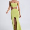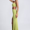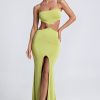 Striking silhouettes elevated with custom-developed hardware. Inspired by the sleek look of separates, the Julitta gown comprises a cropped bodice and maxi-length skirt secured with gemstone-embellished hardware at the center. It’s cut from premium sandwashed jersey with a touch of stretch and is complete with adjustable camisole straps for a customized fit.