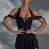 Exude vintage vamp allure in the Elvyra mini dress. This premium dual layered mini dress is designed in our dual layered jersey fabric that sits comfortably against the skin with a single layered mesh overlay that adds a ghostly aspect to this statement Halloween look. Ensuring the style is spooky and seductive, Elvyra features a bust flattering lace up front and halter neckline with delicate bardot straps that fall off the shoulders. Complete with a loose fit, hanky hem skirt, Elvyra is the perfect piece to create a Halloween costume look that’s fun and flattering.