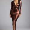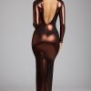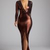 Elegant and captivating, the Safiya evening gown is essential to any elevated evening wardrobe. With a plunging neckline, open back and sultry front split, Safiya is cut to a dramatic maxi length and complete with flattering front knot detailing that further cinches your waist. It’s designed in our premium metallic jersey fabric and features power mesh lining for a comfortable yet sculpting fit.