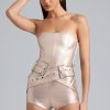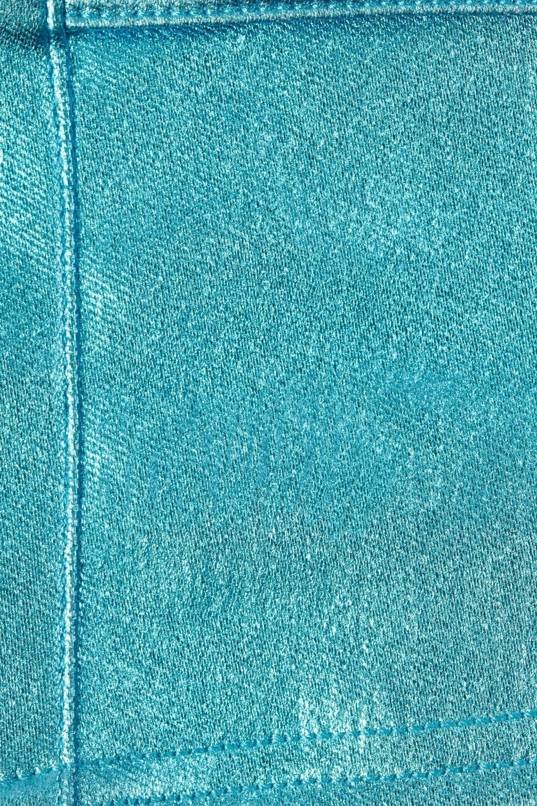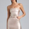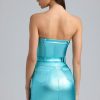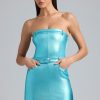 Metallic Denim Belted Strapless Mini Dress in Aqua