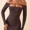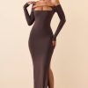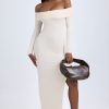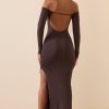 Elevated details for maximum impact. Designed to be dressed up, the Georgie maxi dress is cut to a sleek column silhouette with off-shoulder sleeves and a curved cut-out at the neckline. It features a statement low open back, a thigh-high side split and is crafted from our endlessly soft and stretchy premium jersey made with TENCEL™ Modal fibres, derived from controlled or certified wood sources.
