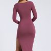 Buttery soft staples. An enduring silhouette you’ll reach for time and time again, the Elysia midaxi dress is crafted from jersey made with TENCEL™ Modal fibres that are naturally soft and smooth to the touch. It’s cut to a fitted silhouette with a square neckline and statement thigh-high split to one side. The flared sleeves are tempered with delicate adjustable ties.