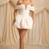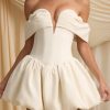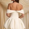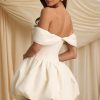 Holiday glamour, perfected. The Jessamy mini dress is crafted from slightly stretchy woven fabric to a stunning off-shoulder silhouette framed with oversized cap sleeves and a plunging sweetheart neckline with internal wiring for structure. It features a built-in corset bodice for enhanced shaping, a voluminous bubble hem skirt, and comes with coordinating jersey shorts for the perfect amount of coverage.