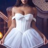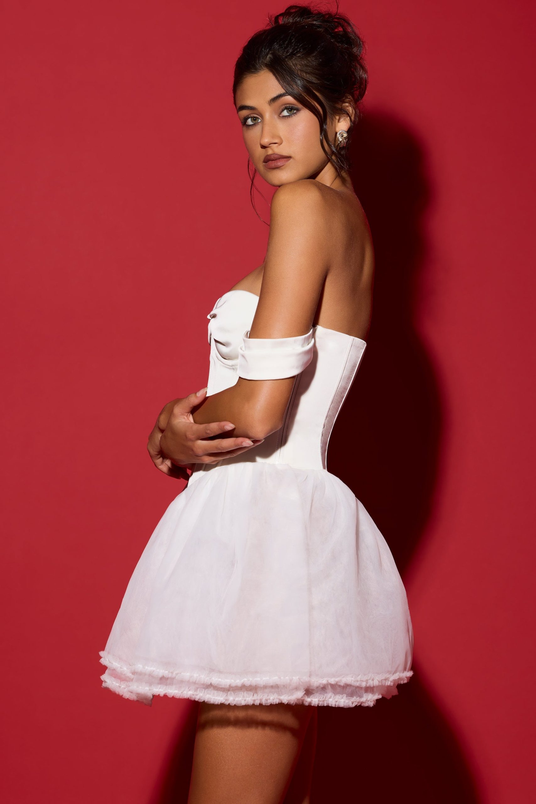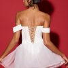 Dress up with the Meredith mini. Available in two hues for customisable styling all season long, it’s crafted to a corseted silhouette with a boned satin bodice for enhanced support, framed by draped off-shoulder sleeves, a delicate sweetheart neckline and an open back with adjustable lace-up ties. It falls to a voluminous tulle skirt traced with ruffle appliqués and features a built-in bodysuit for enhanced coverage.