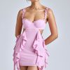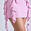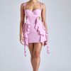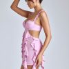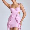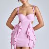 In our girly era. Crafted in our premium georgette fabric with delicate frills and ruffle trims, the Evalia dress was designed to turn heads. Perfect for date nights and drinks with the girls, it’s cut to a mini length with statement waist cut-outs and a curve-skimming A-line skirt.