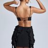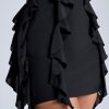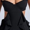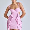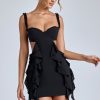 In our girly era. Crafted in our premium georgette fabric with delicate frills and ruffle trims, the Evalia dress was designed to turn heads. Perfect for date nights and drinks with the girls, it’s cut to a mini length with statement waist cut-outs and a curve-skimming A-line skirt.