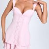 An ode to the romance of summer days. Crafted from a lightweight woven fabric, the Cassandra dress features a sculpted pintucked bodice with shaped cups and falls to a mini length with a ruffled georgette skirt. It’s adorned with decorative fabric-covered buttons at the front and stunning lace-up detailing at the back.