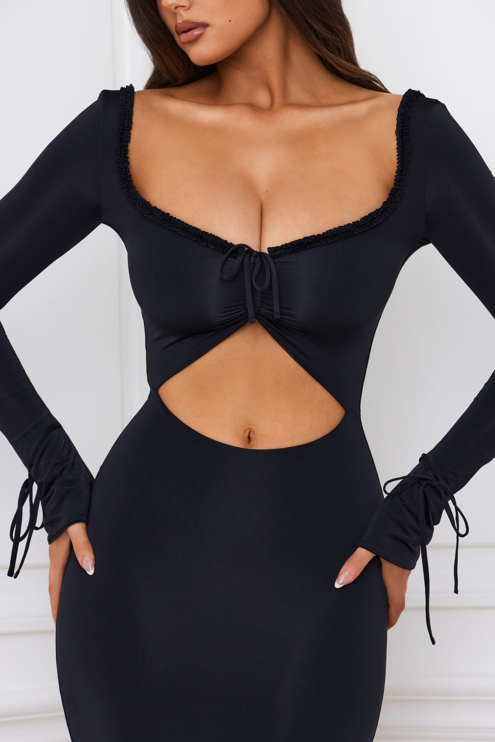 Designed to become your go-to dress for special occasions, the Matilda maxi dress is crafted from premium sheer jersey and lined for enhanced coverage. The figure-hugging bodycon silhouette is elevated with a ruched front cut-out and universally flattering V-neck, complete with delicate ruffle trims. The sweet bow detailing at the cuffs and front cement the romantic inspiration.
