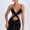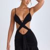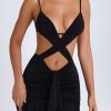 Turn heads in the Cerai mini dress. A statement style, it’s crafted from our premium textured stretch jersey to a crossover bodycon silhouette, complete with ruching, ruffle trims, and waterfall drape detailing at the front. It’s punctuated with figure-enhancing front, side, and back cut-outs, and features adjustable straps for your perfect fit.