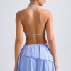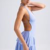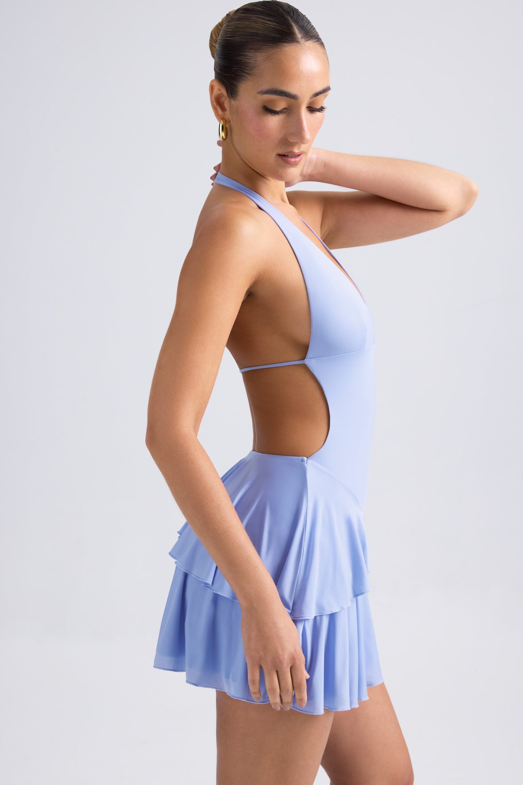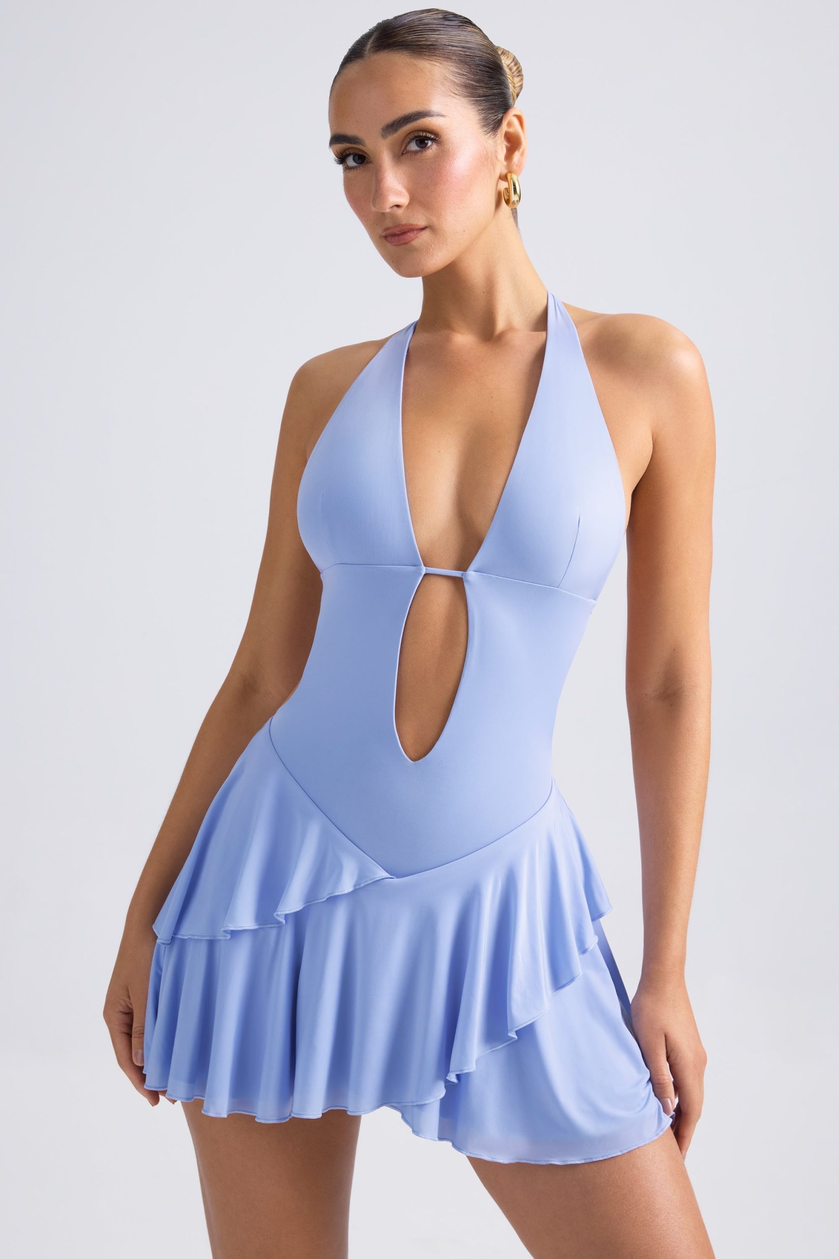 Striking silhouettes. Designed to make an impact, the Chimere mini dress is cut from our premium sheer jersey to a halterneck, A-line silhouette and enhanced with a tiered, ruffled mini skirt. Its punctuated with cut-out detailing at the front and an open back secured with a slender adjustable strap for your perfect fit.