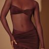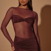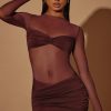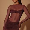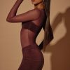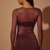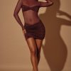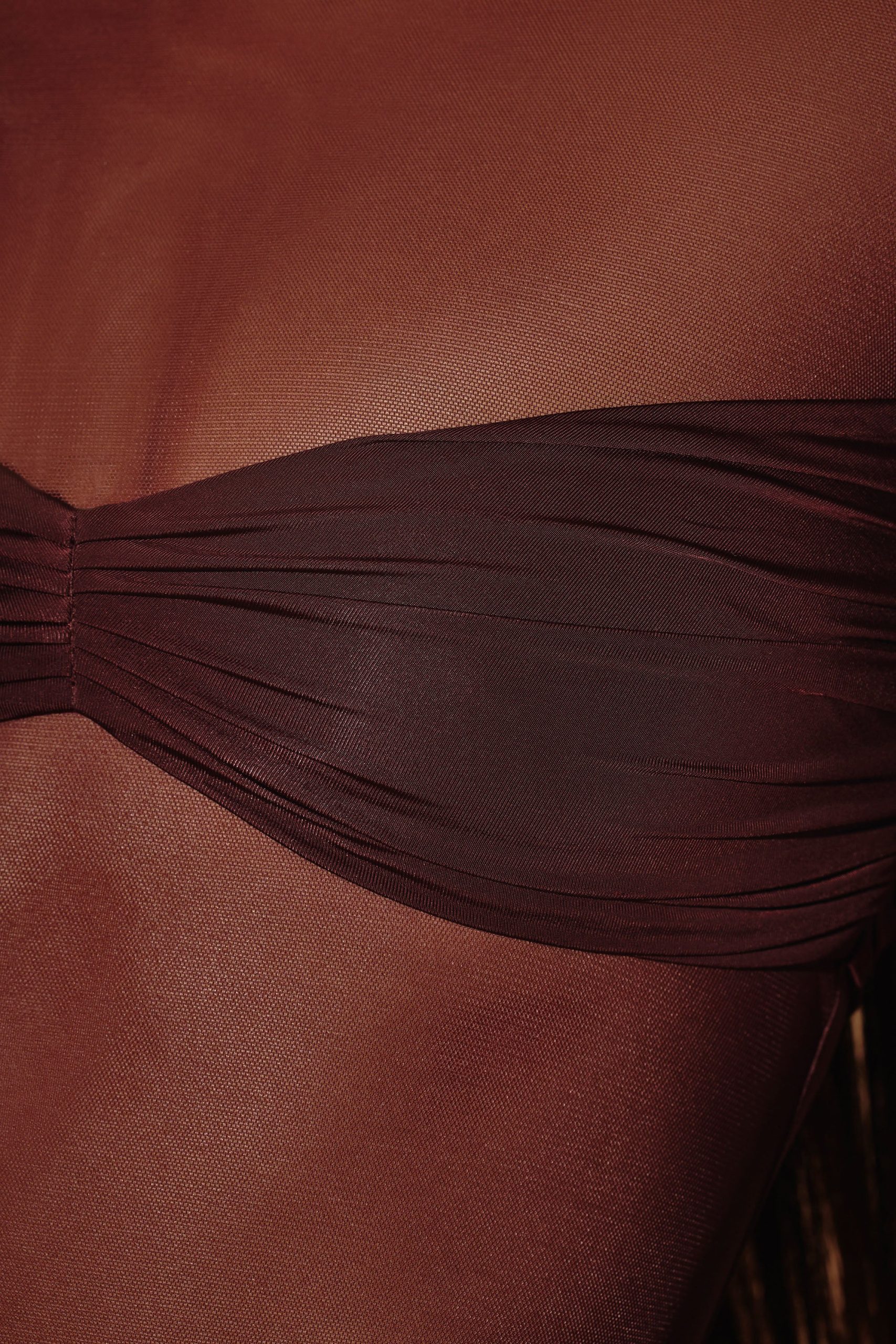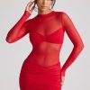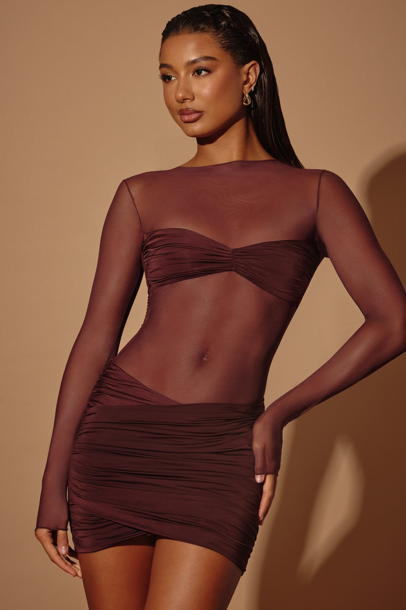 Introducing the Essie mini dress. Designed in our body-hugging slinky jersey fabric with sheer mesh panelling throughout the body, Essie features a slinky jersey panel at the bust and a body contouring design complete with a high neckline, long tight-cut sleeves, and a ruched skirt.