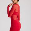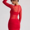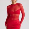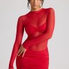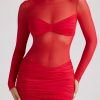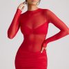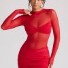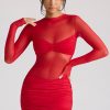 Introducing the Essie mini dress. Designed in our body-hugging slinky jersey fabric with sheer mesh panelling throughout the body, Essie features a slinky jersey panel at the bust and a body contouring design complete with a high neckline, long tight-cut sleeves, and a ruched skirt.