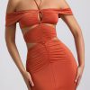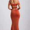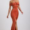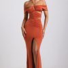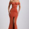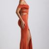 Transcending seasons and events. Designed with memorable occasions in mind, the Karleen gown is cut to a graphic halterneck silhouette, traced with symmetrical cut-outs and draped off-shoulder sleeves that create the illusion of a stunning hourglass shape. It’s made from our premium soft-touch slinky jersey and is punctuated with a dramatic front split.