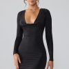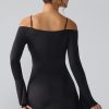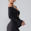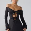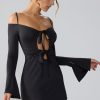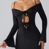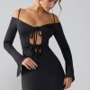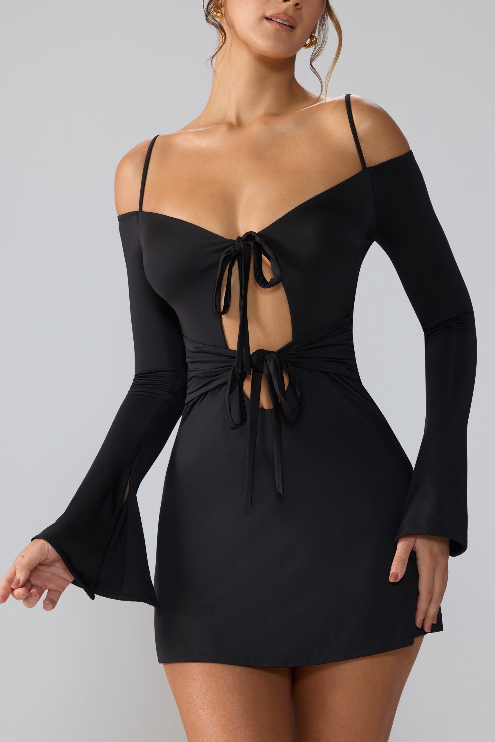 Midnight moments. Designed in a palette of sultry midnight tones, the Sidney mini dress is a statement A-line design featuring seductive front cut-outs and self-tie fastenings at the bust and waist. Cut to a mini length with off-the-shoulder long sleeves, Sidney is cut from our premium slinky jersey fabric that’s soft against the skin and super flattering.