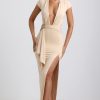Slinky silhouettes amplified with unique elements. The ideal complement to dinner dates and tropical getaways alike, the Amalda dress is cut from our signature jersey fabric to a maxi silhouette with a striking thigh-high front split. It’s framed with a plunging neckline and short cap sleeves, while the waterfall ruffle trim at the waist is secured with custom-developed metal hardware, creating a cinched look.