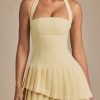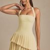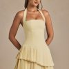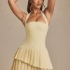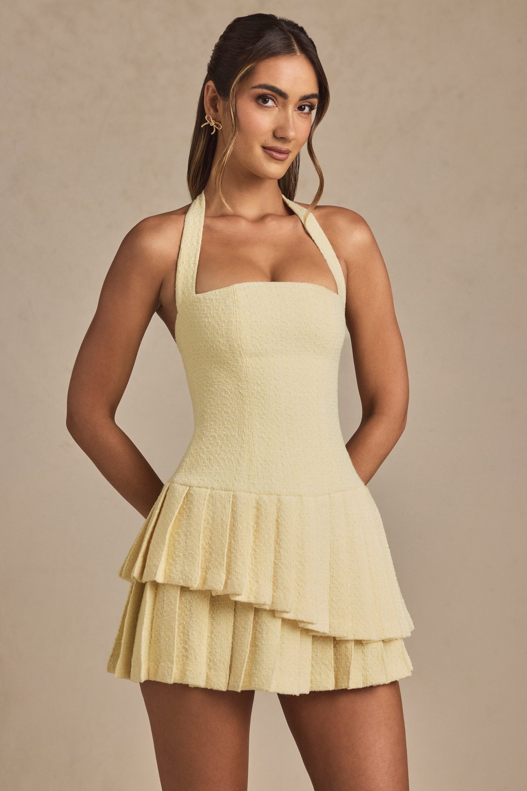 Crafted to precision. Design to define and flatter your natural shape, the Rosaria mini dress is crafted from premium textured tweed to a classic halterneck silhouette with a figure-hugging drop-waist bodice. It’s complete with a layered pleated skirt for stunning movement with every step.