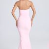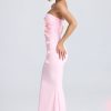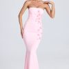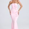 Pretty florals. Inspired by the beauty of botanical gardens in high summer, the Aveline maxi dress is traced with hand-applied floral appliqués that highlight the sculpting fishtail silhouette. Crafted from lightweight georgette that hugs your curves, it’s rendered in two timeless hues and enhanced with perfectly placed ruching at the sides. The slender adjustable straps can be removed for multiple styling options.