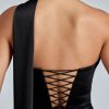 The must-have mini with a statement twist. Crafted from heavyweight matte satin in a versatile monochrome palette, the Anastasia dress is cut to a figure-skimming A-line silhouette. It features a draped bandeau neckline accentuated with an asymmetric neck scarf and turns to reveal a lace-up back inspired by classic corsetry.