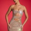 Modern glamour meets elevated design with the Ilana mini dress. A semi-sheer design crafted from premium 40D power mesh, it’s cut to a figure-skimming A-line silhouette and saturated with custom HOTFIX embellishments arranged in a grid-like pattern for high-impact sparkle. It features a keyhole cut-out at the front mirrored with an open back and darts at the bust for enhanced shaping.