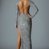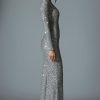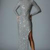 Classic silhouettes, statement details. Designed with your most memorable occasions in mind, the Leonie gown is crafted from premium, double-layered stretch fabric and saturated with scores of sparkling sequins. It’s cut to a high-neck silhouette with a statement curved cut-out at the back and a thigh-high side split.