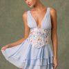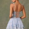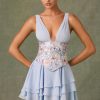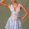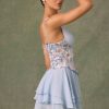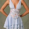 Pretty florals meet unique construction with the Sakura mini dress. Crafted from layers of lightweight chiffon with a plunging neckline and dynamic tiered skirt, it’s overlaid with a waist-cinching corset crafted from mesh and decorated with custom floral appliqués and sparkling embellishments that coordinate perfectly. It’s complete with a signature lace-up back and adjustable rouleau straps for a custom fit.