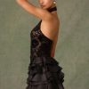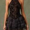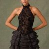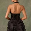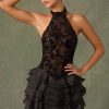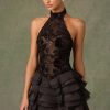Art you can wear. Unmatched in attention to detail, the Petalia mini dress is crafted with a premium V-shaped velvet mesh bodice for enhanced shaping and adorned with flocked floral appliqués, brought to life with sparkling sequin embellishments. It’s cut to a halterneck silhouette with a statement open back and features a voluminous tiered ruffle organza mini skirt that holds its shape.