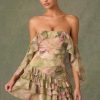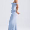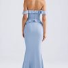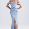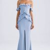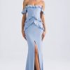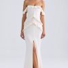 RSVP with ease. A stunning silhouette for special occasions, the Hemera gown is cut from lightweight stretch georgette to a statement off-shoulder silhouette traced with cascading ruffle trims. It features a built-in corset bodice for comfortable shaping and falls to a universally flattering fishtail skirt, complete with a thigh-high split for ease of movement.